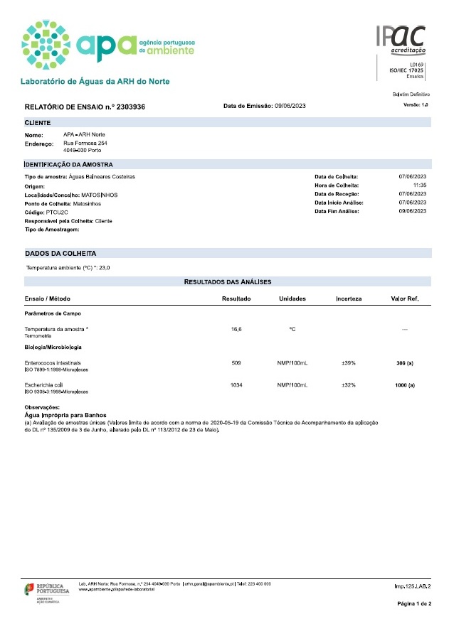 A dias do começo da época balnear, uma vez mais a Agência portuguesa do ambiente, apurou, nas praias de Matosinhos, a presença de valores microbiológicos, em águas costeiras, acima dos parâmetros de referência ditos máximos recomendáveis para Enterecocos Intestinais e para Escherichia Coli, de extrema perigosidade para a saúde pública dos banhistas.
