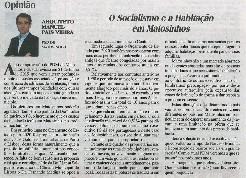 Em primeiro lugar no Orçamento de Estado para 2020 foi proposta a eliminação dos vistos Gold nas áreas urbanas de Porto e Lisboa, desta forma naturalmente que a pressão imobiliária aumentará nos concelhos limítrofes aos quais Matosinhos pertence. A falta de bom senso nesta proposta é tal que o correligionário da Draº Luísa Salgueiro e autarca da Câmara Municipal de Lisboa o Dr. Fernando Medina se opõe a esta medida da administração Central.